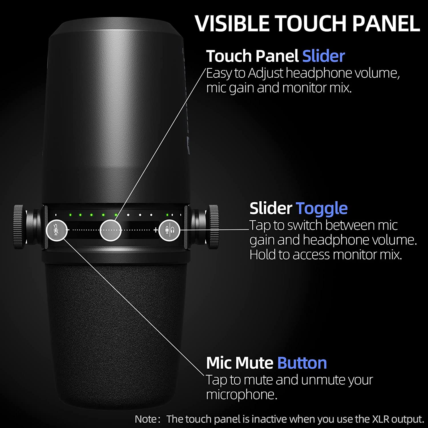 • INTUITIVE TOUCH PANEL: The LED touchable panel for control over gain, monitoring volume, headphone mix and mic muting.